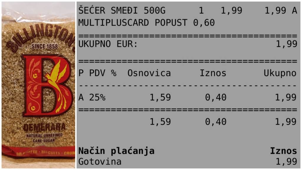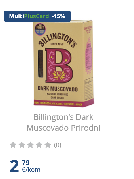 Muscovado I usually buy costs 3.25 per bag (500 g). I need this for my homemade chocolate chip cookies. The one that is currently on sale in Konzum costs only 2.79 per bag (500 g)! This is the sweetest deal this week.